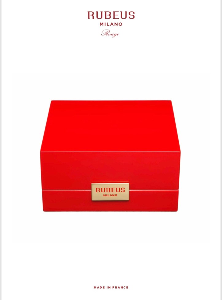 La boccetta è racchiusa in un elegante cofanetto in legno laccato foderato di velluto che ricorda la classica fodera color rubino di tutti i modelli delle borse di Rubeus Milano.