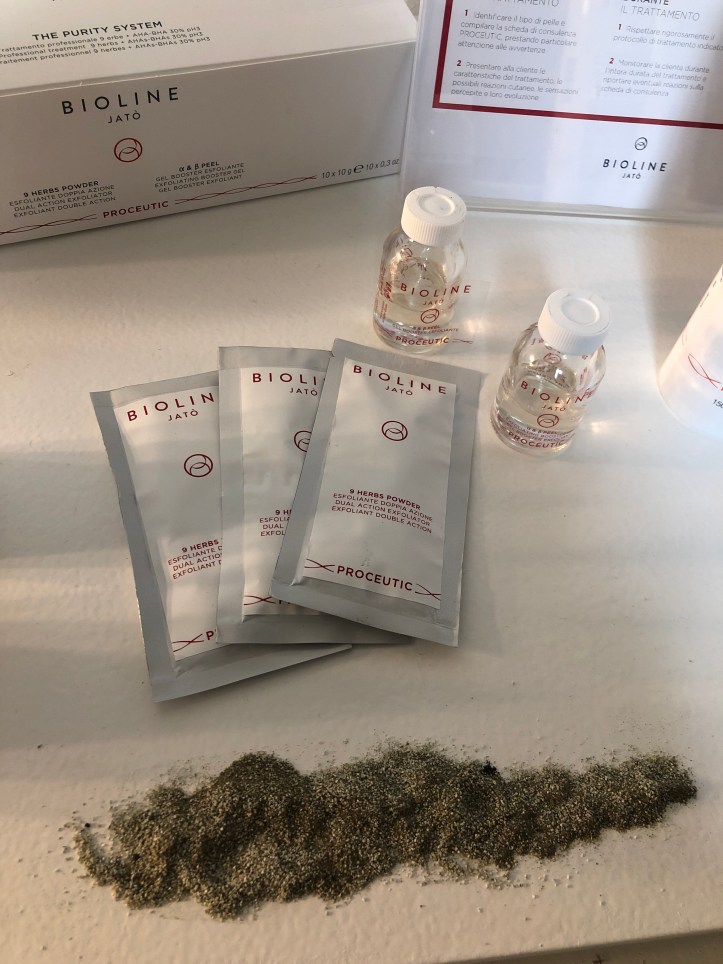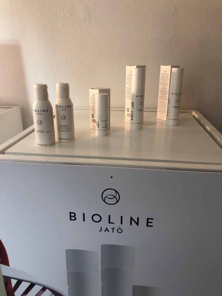 Vi sono prodotti da cabina e prodotti per la cura della pelle domiciliari; in cabina Bioline propone un peeling con ph 3 con concentrato al 30 per cento con una sinergia di retinoidi per un effetto anti age. Mentre per le pelli impure vi è altresì un peeling alle erbe.