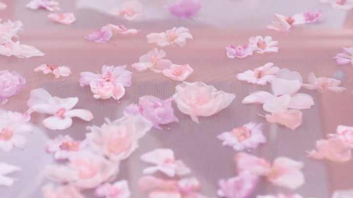 GLI STRATI DELLA SUA GONNA ROSA IN TULLE RICAMATA CON FIORI DI SETA DIPINTI A MANO LE VOLTEGGIANO ATTORNO.