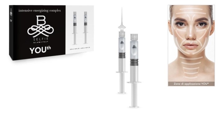 B-SELFIE YOUth è un intenso siero che dona al viso una nuova cascata d’energia, per una pelle idratata, compatta e luminosa. È un potente cocktail vitaminico, antiossidante e profondamente energizzante per il viso. Una formula unica per un effetto botox-like e filler-like sorprendente, grazie alla sinergia tra l’acido ialuronico ad alto peso molecolare, l’acido ialuronico cross-linkato, l’acetyl octapeptide-3 e un potente blend di vitamine. La penetrazione in epidermide è agevolata dai due acidi ialuronici che, grazie alla tecnologia dei nanosomi, veicolano i principi attivi in profondità. Due pratiche siringhe con applicatore topico consentono un entusiasmante auto-trattamento per un viso immediatamente più giovane, luminoso e dai contorni ridefiniti. Un prodotto rivoluzionario anche per l’elevata concentrazione dei suoi potenti attivi, che estende a tutti la gratificazione di un trattamento professionale di semplice esecuzione domiciliare (Utilizzo: 1-2 trattamenti mensili. Formato: 2 siringhe in vetro con applicatore per uso topico da 2,25 ml. Confezione sufficiente per una settimana di trattamento. Prezzo consigliato al pubblico: 79 €).