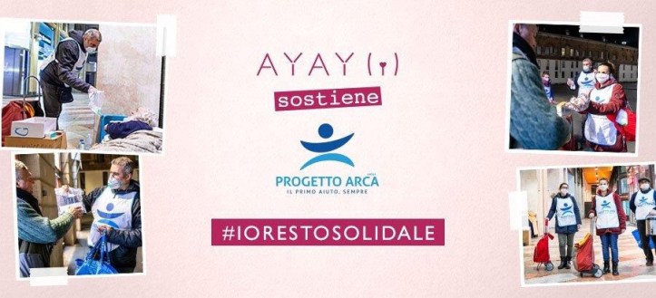 I brand IDT spa, Ayay e Bodyboo devolveranno a Progetto Arca l’intero incasso della prossima settimana a Progetto Arca, impegnato nella campagna di raccolta fondi #Proteggiamoli!, per acquistare 50.000 presidi sanitari, 10.000 flaconcini di gel disinfettante, 15.200 mascherine usa e getta, 22.000 guanti monouso, 300 camici monouso, 285 tute monouso, 236 litri di disinfettante.