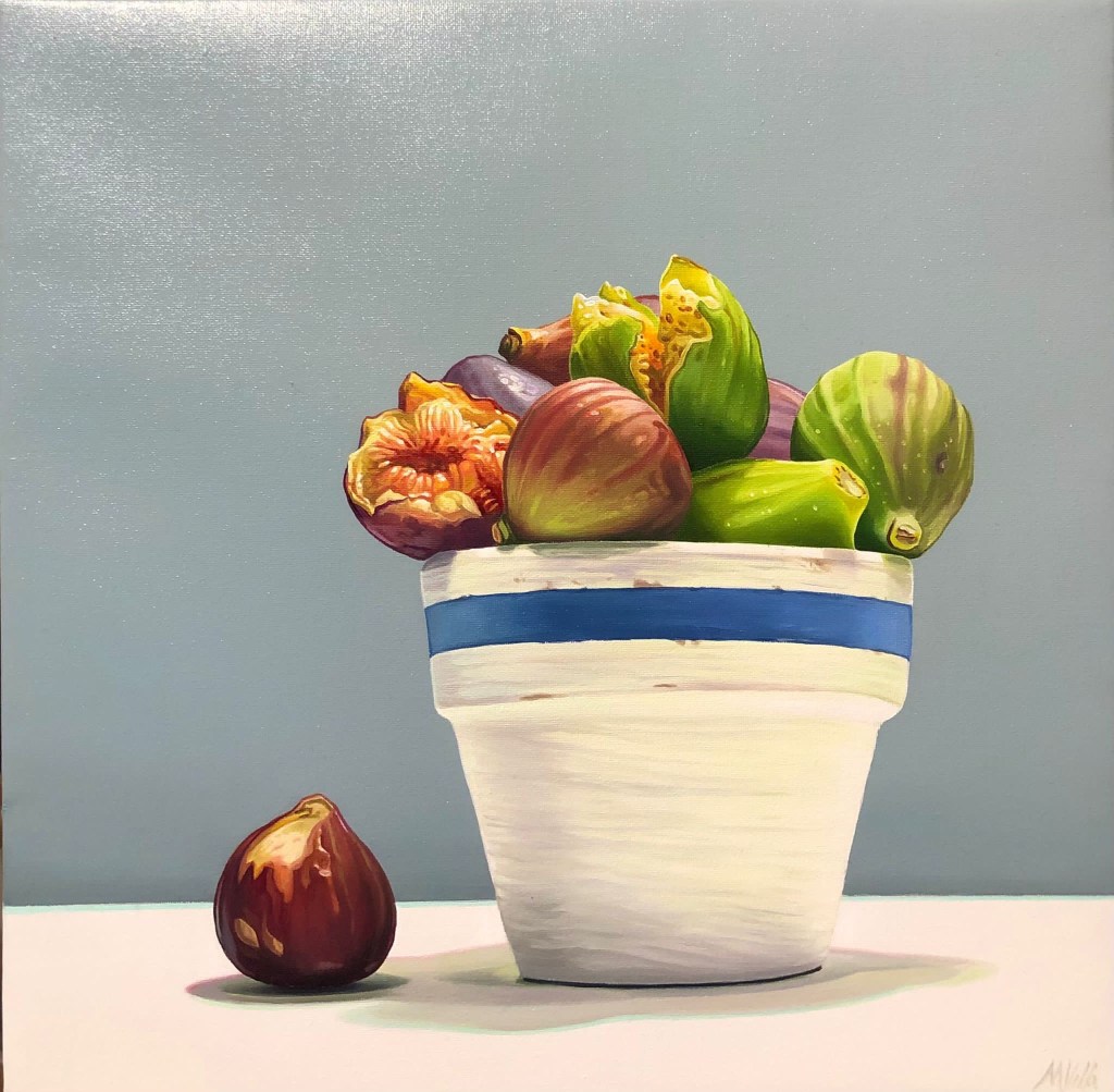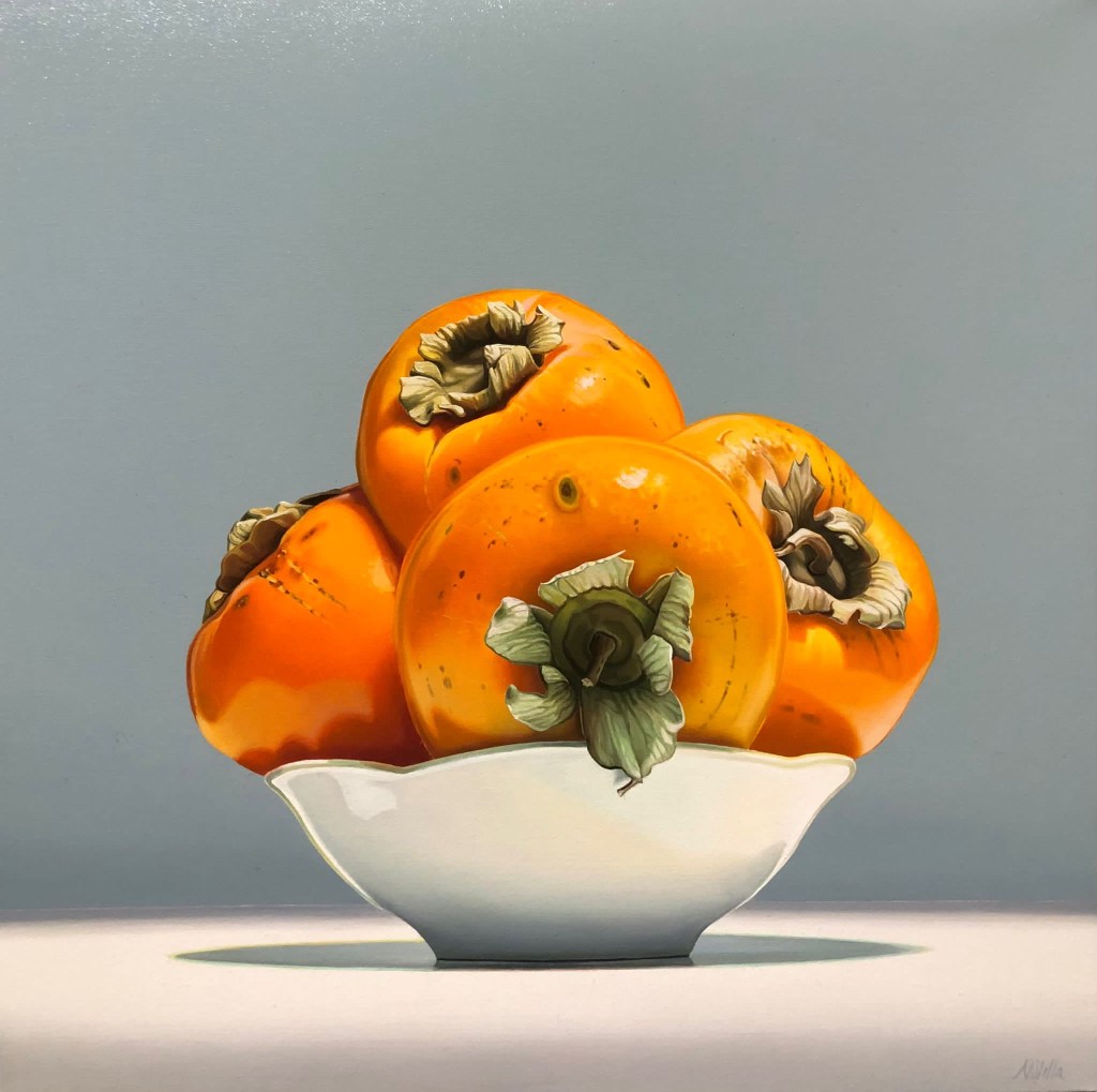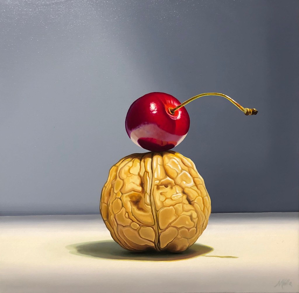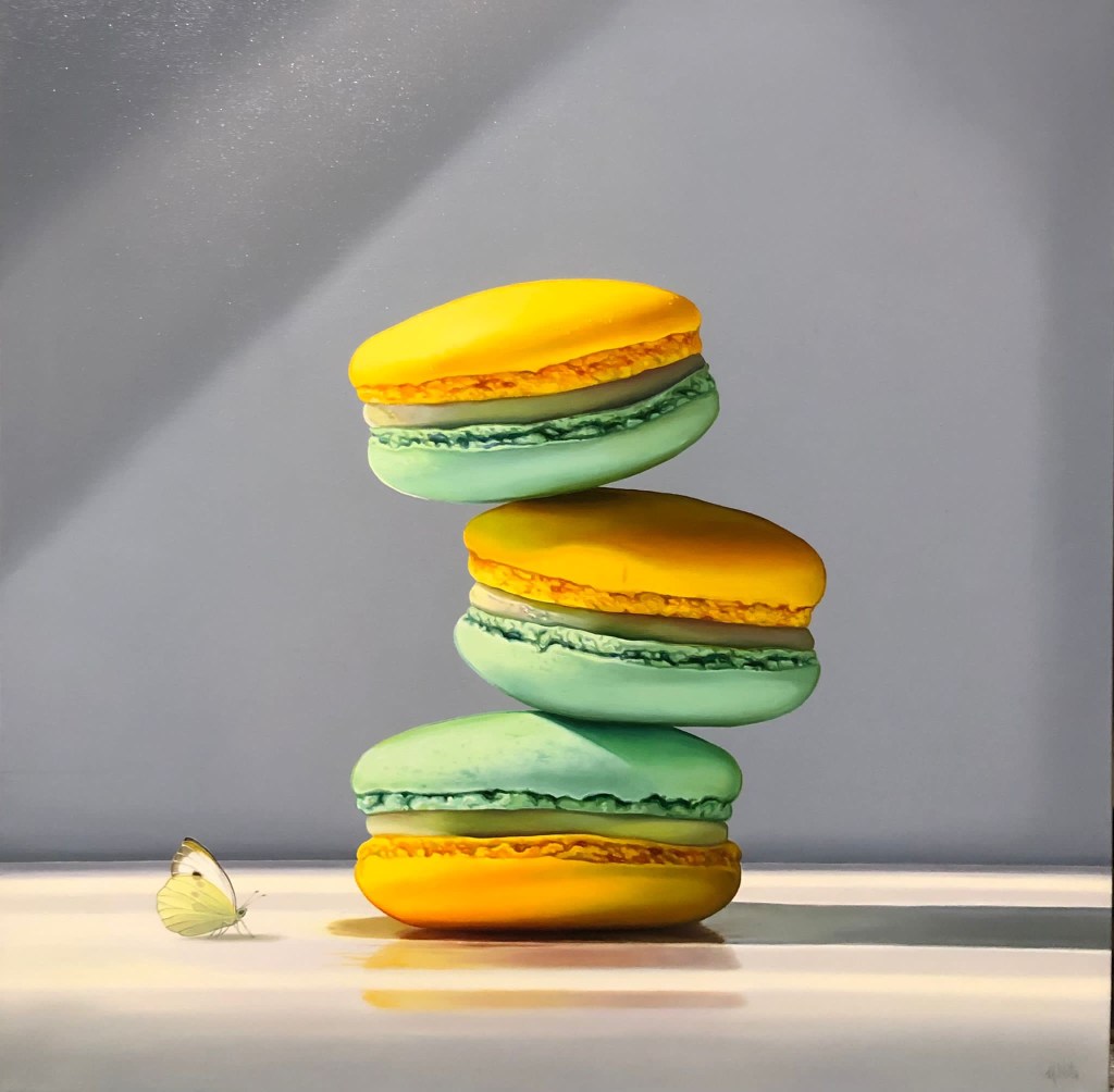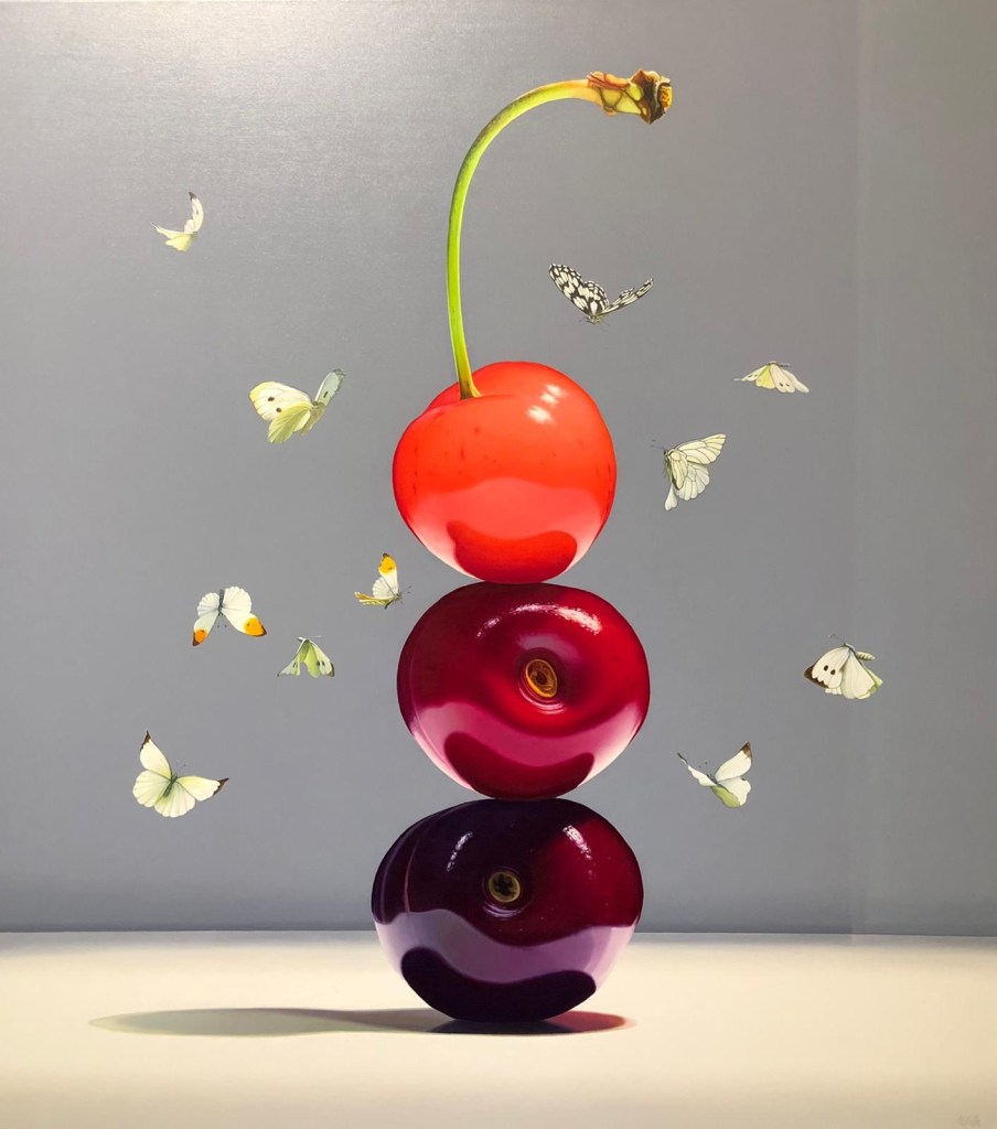 In mostra ventidue nature morte iperrealiste, dal carattere quasi metafisico, realizzate con la tecnica dell’olio su tela. Si tratta di deliziose ciliegie, dai colori sgargianti, sovrapposte con maestria e circondate da farfalle reali, riconoscibili, perfettamente rintracciabili nei manuali di entomologia; di ciliegie isolate appese con un filo sopra un piattino in ceramica bianca, ad evocare una sensazione di silenzio e sospensione; di limoni dalle bucce irregolari, fatti di concavità e convessità, uno accanto all’altra, in un continuo gioco di luci e di ombre, anch’essi composti in costruzioni verticali; di cachi e di fichi così morbidi e freschi che invitano a gustarli; di frutta secca impilata o raccolta in una tazzina di porcellana bianca; di macarons colorati adagiati uno sull’altro e ruotati di pochi gradi a volere raggiungere un equilibrio statico, una delicata armonia tra luci e ombre, volumi e colori.