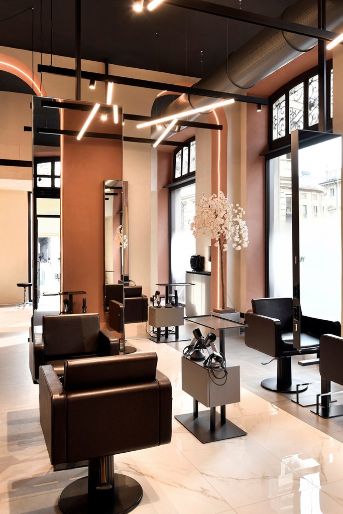 A partire dalla scelta della location, il nuovo salone TONI&GUY Bodoni è un mix di accostamenti tra materiali preziosi ed elementi ricercati, visibili già dall’ingresso per porre i clienti al centro della beauty experience, fin dall’accoglienza. Il Rame Rosa e il Marmo Calacatta Gold, diventano elementi materici fondamentali nella personalizzazione degli arredi principali nel salone. Sontuosi archi sovrastano la parte superiore del salone combinati a luci al neon: il “Match” perfetto