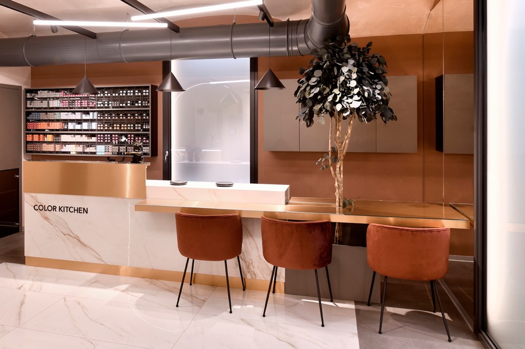 Non meno importante il piano sottostante, con uno spazio completamente adibito al mondo della colorazione. Elemento principale della sala, la Colour Kitchen: una vera e propria cucina riservata alla creazione e miscelazione delle colorazioni live in compagnia della cliente. La grande convivialità di una casa spesso è proprio la cucina. Prosegue l’utilizzo di materiali ed elementi iconici del salone anche in questa