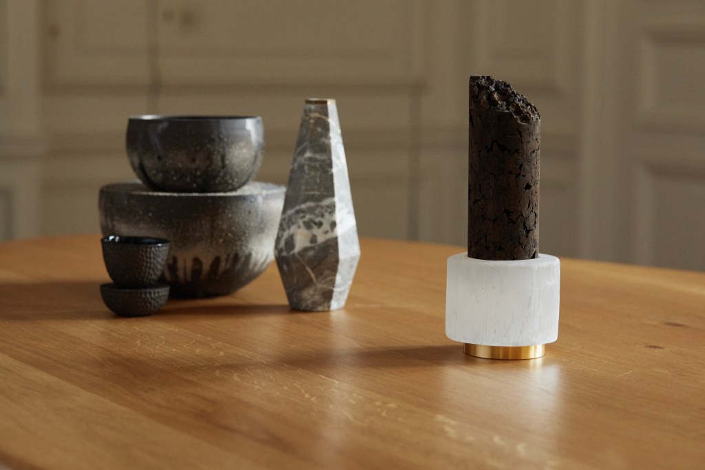 Sughero bruciato: vero e proprio materiale ecologico e naturale, il sughero è caratterizzato da un rapido rinnovamento, che consente di progettare oggetti duplicabili, riciclabili ed ecologicamente neutri. La sua natura porosa gli permette di ricevere il profumo concentrato che diffonde delicatamente, mescolando il suo sottile sentore di fumo.