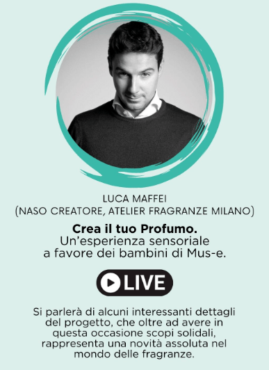 Lunedì 23 ottobre alle 16.30 Accademia del Profumo ospiterà sul proprio canale Instagram Luca Maffei, CEO di Atelier Fragranze Milano, e Maria Garrone, Presidente di Fondazione Mus-e Italia ETS, per anticipare i contenuti dell’appuntamento del prossimo 9 novembre a Milano a favore dei bambini della Fondazione.