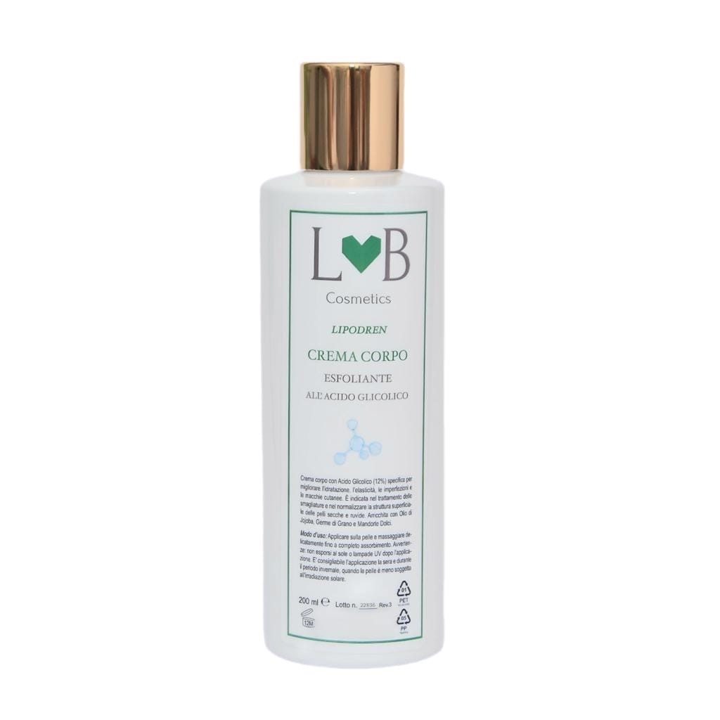 Lipodren Crema Esfoliante Acido Glicolico. Crema corpo con Acido Glicolico (12%) specifica per migliorare l’idratazione, l’elasticità, le imperfezioni e le macchie cutanee. È indicata nel trattamento delle smagliature e nel normalizzare la struttura superficiale delle pelli secche e ruvide. Arricchita con Olio di Jojoba, Germe di Grano e Mandorle Dolci. E’ consigliabile l’applicazione serale per effettuare un esfoliazione chimica notturna e risciacquare il mattino dopo sotto la doccia. Prezzo al pubblico € 48 il formato da 200 ml.