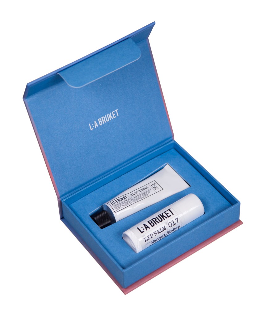 In occasione del Natale L:A BRUKET ha presentato due kit per affrontare il freddo. Uno contenente il Lip Balm 017 e l’Hand Cream 092 dai sentori di salvia, rosmarino e lavanda; il secondo contenente il Lip Balm 017 e l’Hand Cream 102 al bergamotto e patchouli.