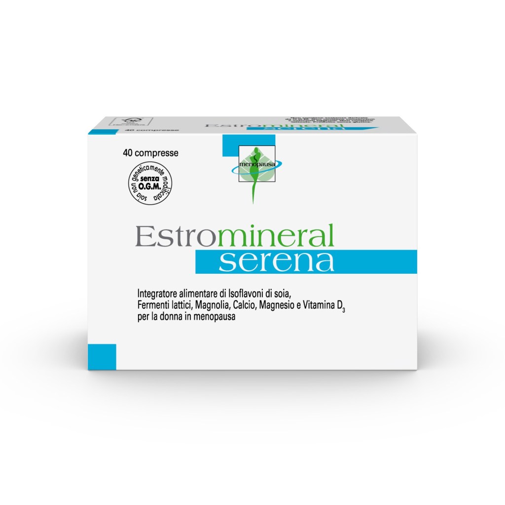 Una compressa di Estromineral Serena contiene Glycine max L. Merr. e.s. 150 mg (equivalente a 60 mg di Isoflavoni di soia), Magnolia officinali Rehder & Wilson e.s. 50 mg (equivalente a 0,75 mg di Honokiolo), Lactobacillus sporogenes (Bacillus coagulans) 500 milioni di spore, Vitamina D3 5 µg, Magnesio 60 mg e Calcio 141 mg.