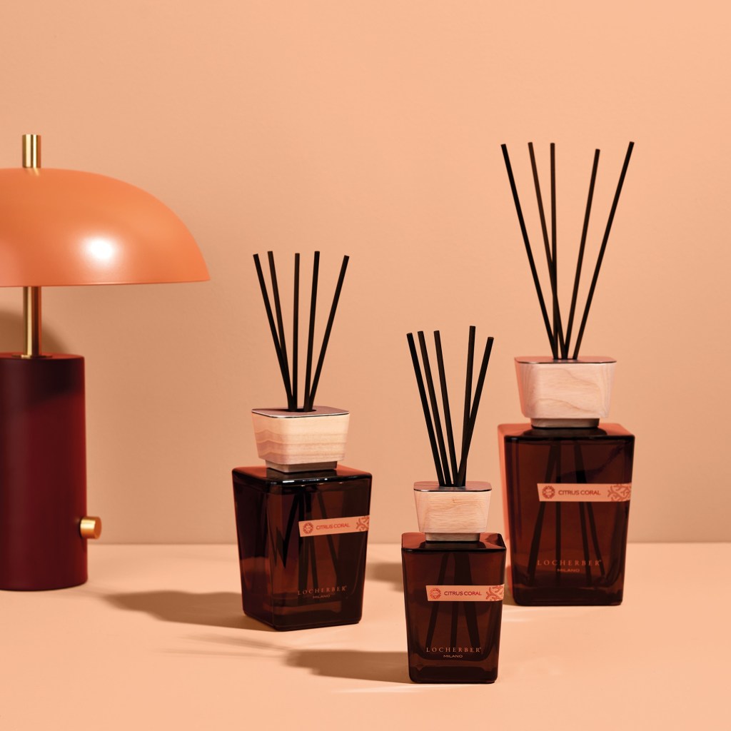 CITRUS CORAL va ad arricchire la Skyline Collection, eleganti flaconi (di diversi formati da 125 ml a 5000 ml) dal design slanciato e contemporaneo, realizzati da maestri vetrai italiani in vetro fumé scuro e impreziositi dall’iconico tappo T2 in frassino verniciato bianco. Per i formati da 1 litro e da 2.5 litri il prodotto può essere impreziosito dai tappi rari in marmo e pietre semipreziose.