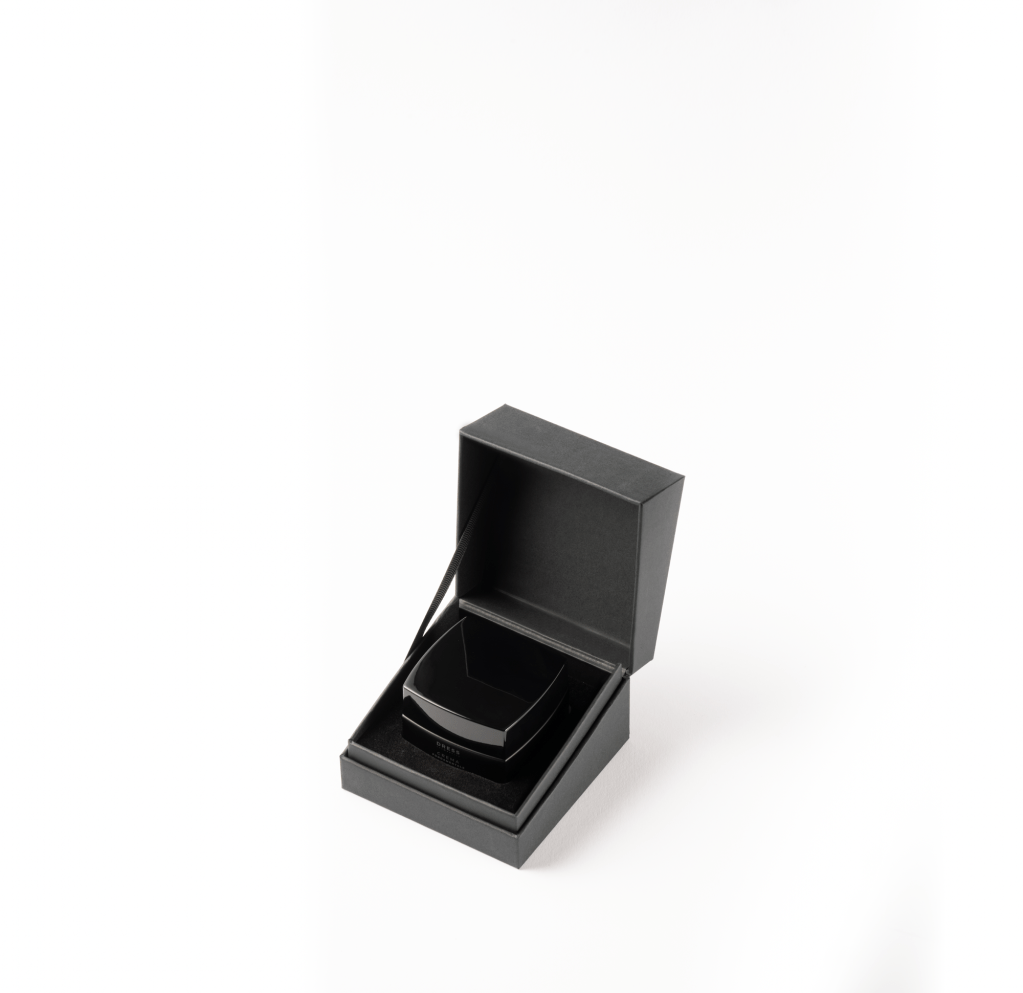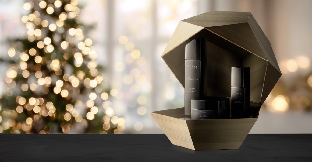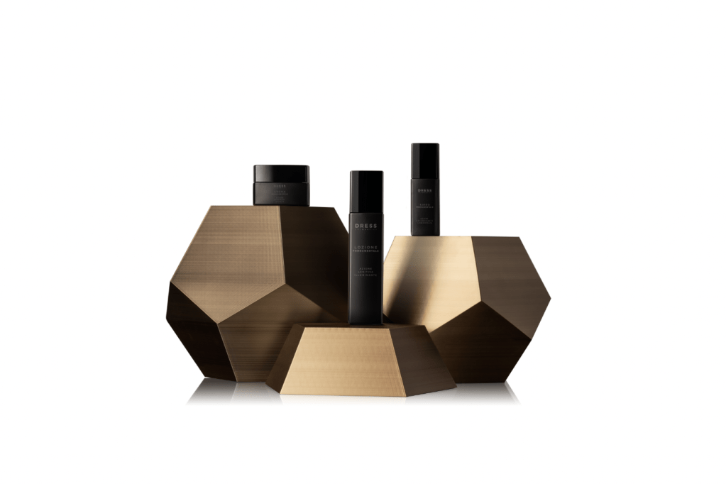 Creato grazie alla tecnologia della stampa 3D applicata secondo un disegno ad hoc commissionato appositamente per DRESS, ogni cofanetto racchiude l’intera routine cosmetica del brand: Lozione, Siero e Crema.
